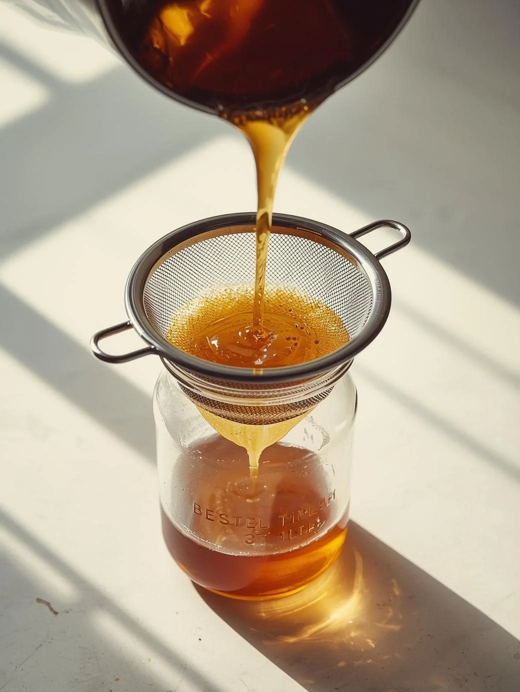 Then I pour it through a fine mesh strainer into a glass jar. This catches any bacon bits that might make the grease spoil.