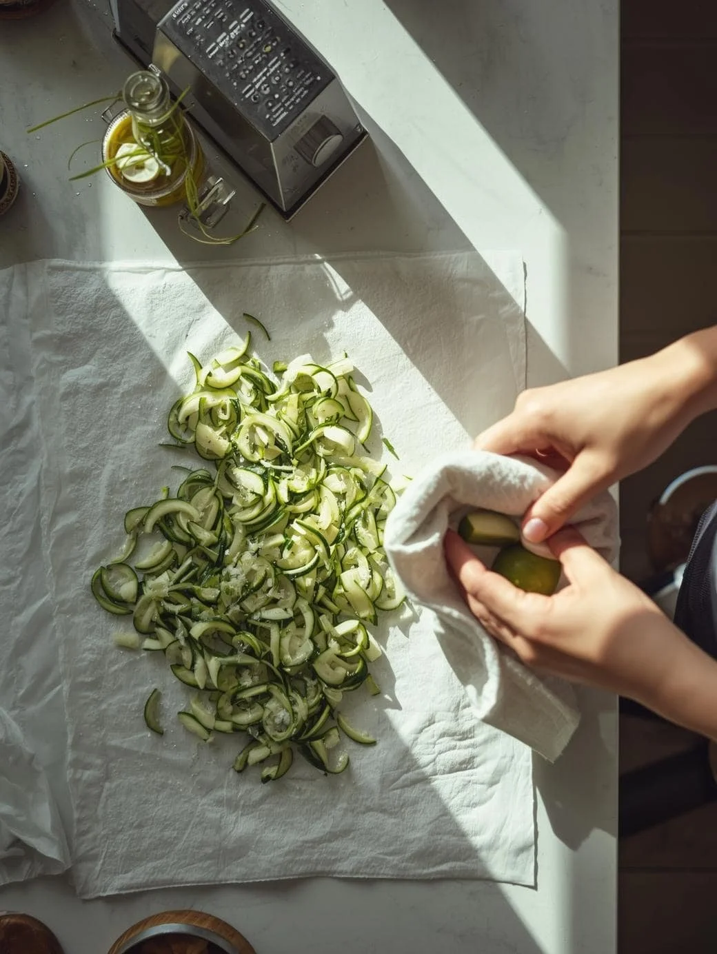For grated zucchini: I spread it on paper towels, sprinkle with salt, and let it sit for 10 minutes. Then I squeeze it in a clean kitchen towel to get rid of extra water.