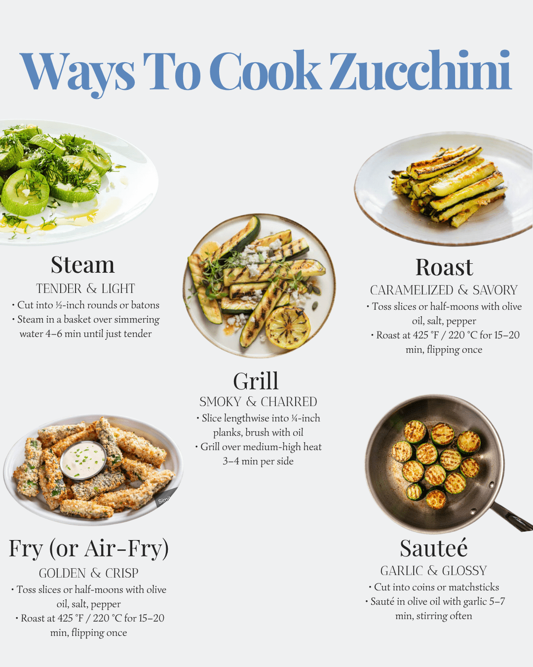 Air fryer zucchini cooks even faster and gets perfectly crispy. I cut zucchini into coins, toss with oil and seasonings, then air fry at 400°F for 8-10 minutes.