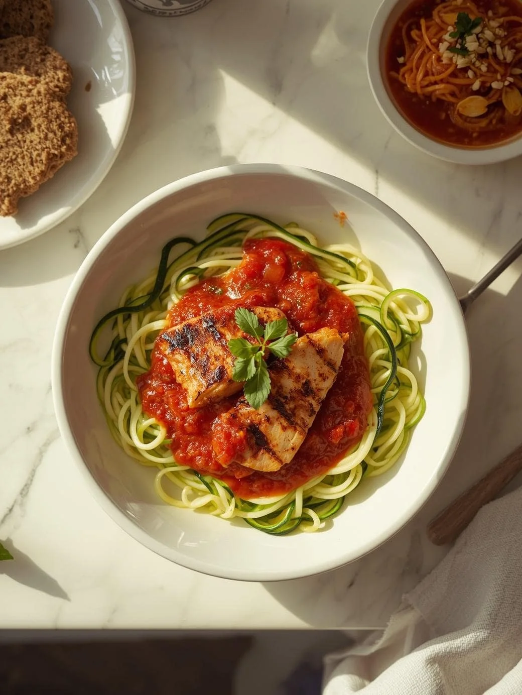 For a hearty meal, I toss the noodles with marinara, grilled chicken, and parmesan. Sometimes I mix half zucchini noodles with half regular pasta—it's the best of both worlds.