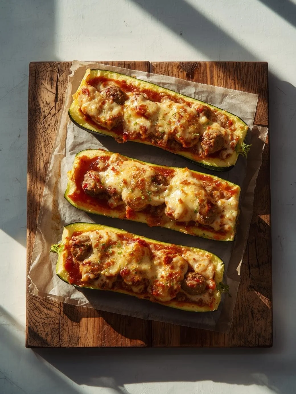 Baked zucchini boats cook perfectly at 375°F for about 25 minutes. I stuff them with the sausage mixture and top with extra mozzarella for a golden, bubbly finish.