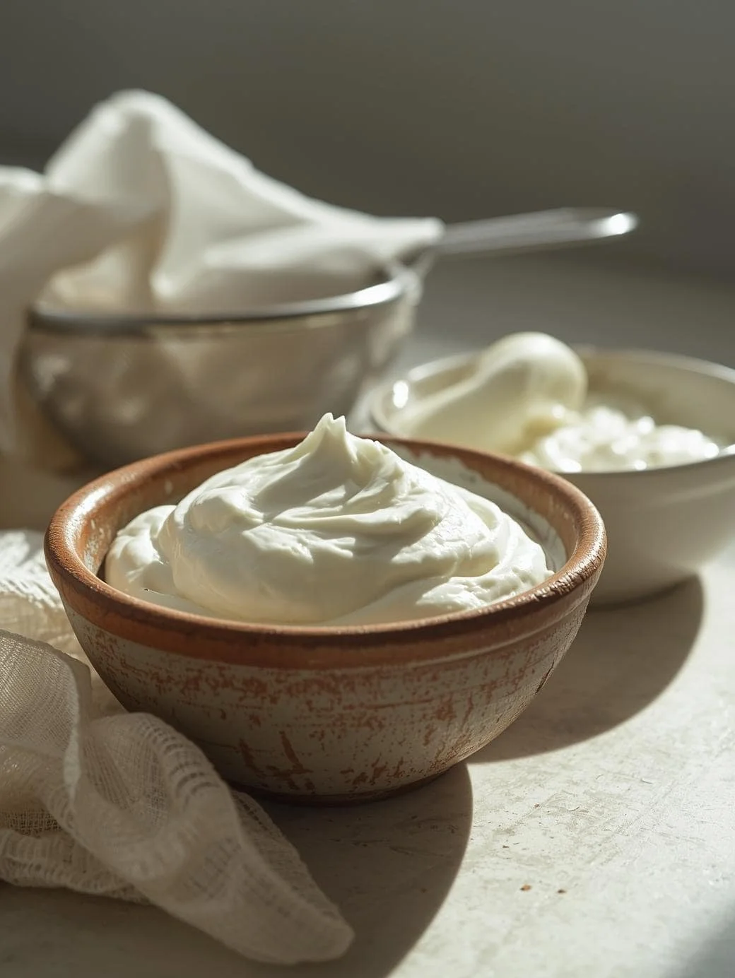 After fermenting, it gets strained through cheesecloth or a fine mesh, which removes most of the whey—that liquid part of milk.