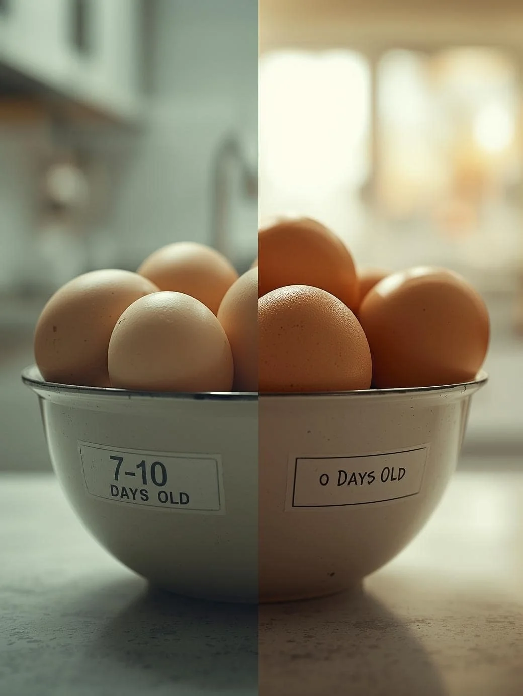 Slightly older eggs stand upright but stay on the bottom. These are 1-2 weeks old and peel great.