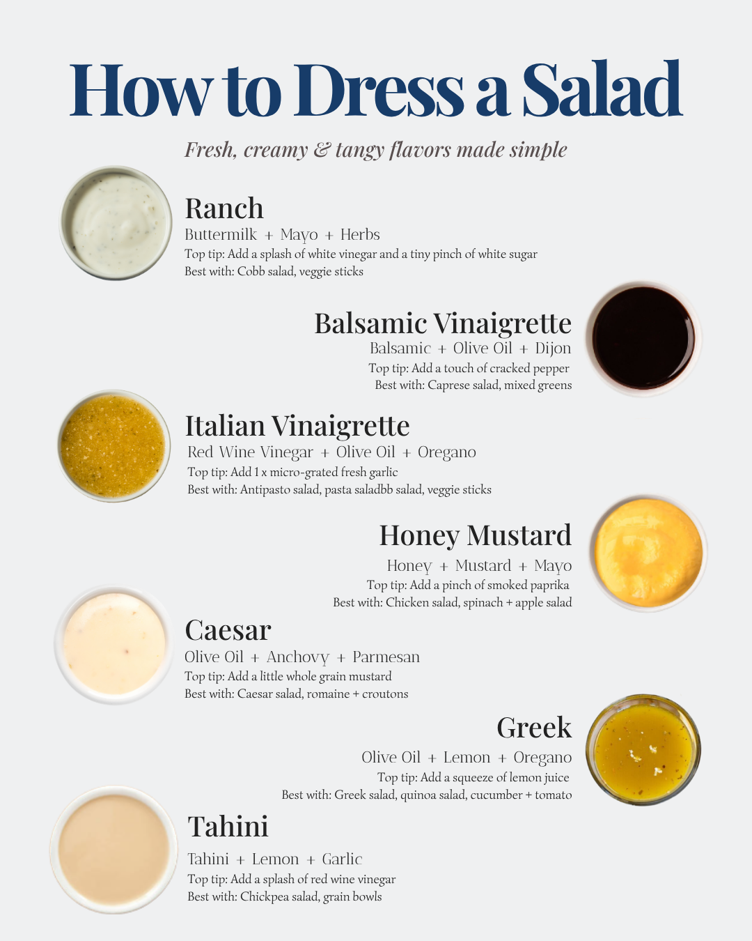 The key is matching flavors. Mild veggies need bold dressings, and strong ones like roasted garlic can handle lighter vinaigrettes.